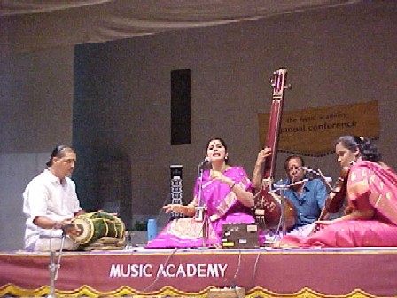 Brova bharama in Bahudari again was very weak, with patently wrong phrases like m d p d p m g s being featured in her kalpanaswaras. The Todi alapana, preceding the kriti Ninne namminanu, tried to incorporate unnecessary Hindustani oriented jaru-s between ga and dha in the middle octave. Anuradha might have still carried it off, if only she had paid better attention to Sruti. The neraval in the Charanam line, Kamakshi Kanjadalayatakshi, was mediocre at best. The only point of note in Anuradha’s concert was the Trikalam plus Chaturasra Tisram, and Pratiloma exercise in the Latangi Ragam Tanam Pallavi (Karimoralida leda kapada leda Srikrishna). The wierd thing here was that these laya exercises were done at the end of the kalpanaswaras rather than at the end of the neraval. Another unpalatable feature was the set of mannerisms, bordering on exhibitionism, that Anuradha assumes on stage. Although endowed with a voice that she could put to better use, she seems to prefer the flimsy and light-weight. Add to this the fact that she modulates it beyond what is necessary and you ended up with a thin and unsteady voice which could hardly carry with conviction the weight of classical music. The overall impression of the artiste can be summed up in a comment that was overheard - 'a half-empty vessel'. Of course, a half-empty vessel is also half full, and one hopes that Anuradha realizes her potential and sings accordingly. Dr. Jyotsna’s violin accompaniment strove to cover for the weak vocal rendition, but cannot be said to have succeeded beyond a point. The violin tone was a trifle too shrill, which was perhaps a consequence of the high pitch. Kalakkadu Srinivasan on the mridangam provided competent percussive support. General remarks: Voice: Generally