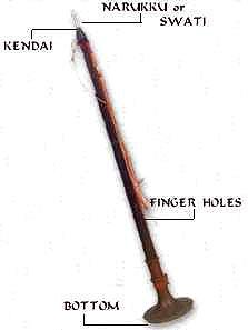 Construction: The Nagaswaram is a double reed instrument with a conical bore that gradually enlarges towards the lower end. It is usually made of a type of seasoned ebony, although there are Nagaswarams made of sandalwood, redwood, silver, gold, etc. The top portion consists of a metal staple (called mel anaichu) and into this is inserted a small metallic cylinder called kendai. The kendai carries the mouthpiece, seevali, which is made of reed. Along with spare reeds, a small needle, known as kuchchi, made of ivory or horn, is attached to the Nagaswaram. The needle is used to clear the mouth-hole of saliva particles and allow air to pass through. The bottom is decorated with a metallic bell called the keezh anaichu. |